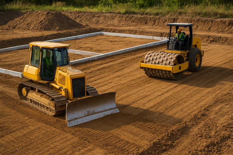 La compactación del suelo mejora su resistencia mecánica, reduce el riesgo de asentamientos y optimiza la capacidad portante. Mientras que la nivelación precisa del terreno asegura una correcta pendiente para drenajes y una superficie uniforme para el montaje estructural.